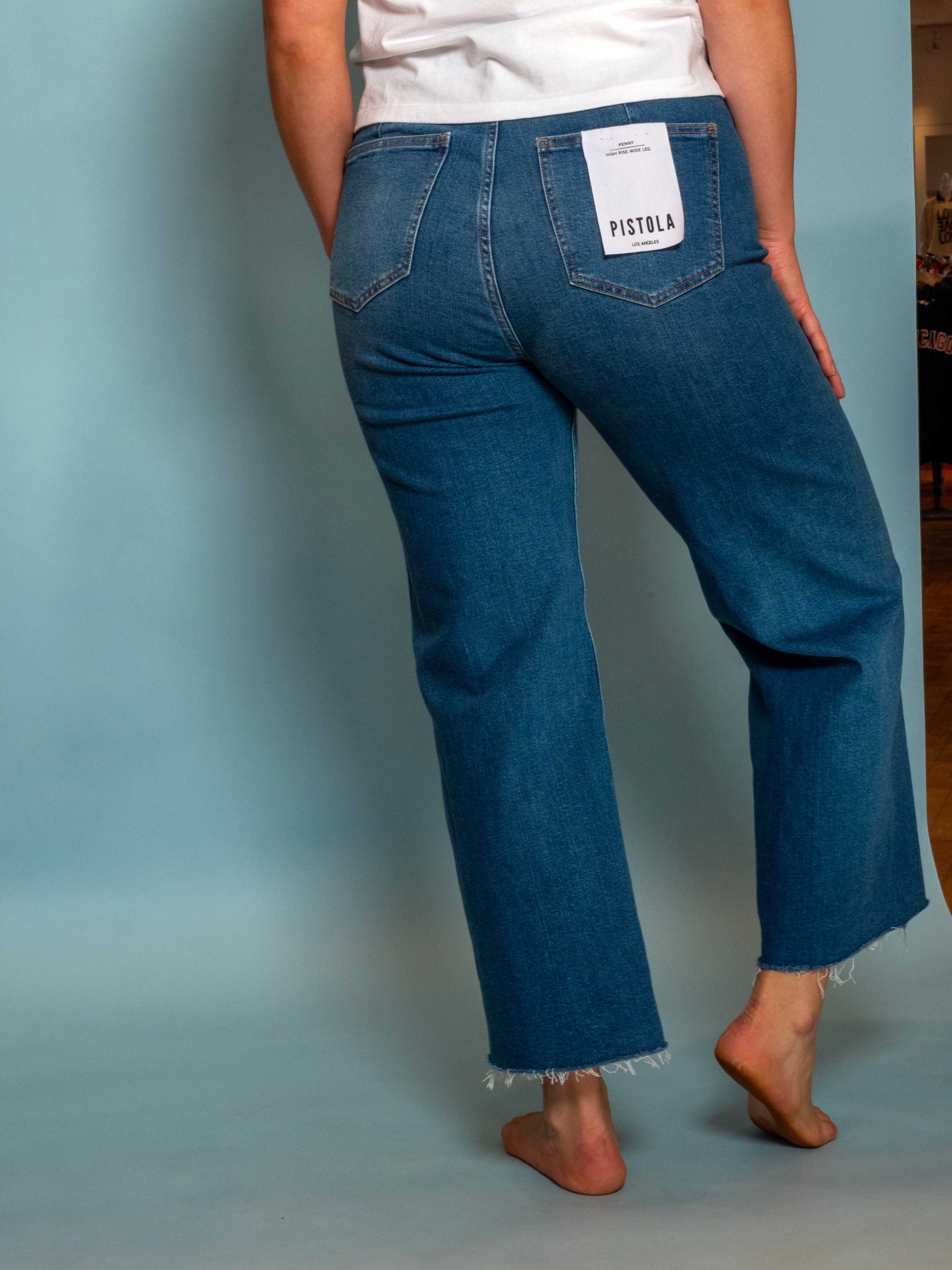 • A signature silhouette with timeless appeal, Penny sits high at the waist with an ultra-wide leg and full-length 28" inseam that creates effortless balance and movement. The relaxed shape flows with ease, while the structured rise keeps proportions clean and refined. Crafted from comfort stretch fabric in Rooftop, a medium blue wash with soft fading for an easy, lived-in feel.